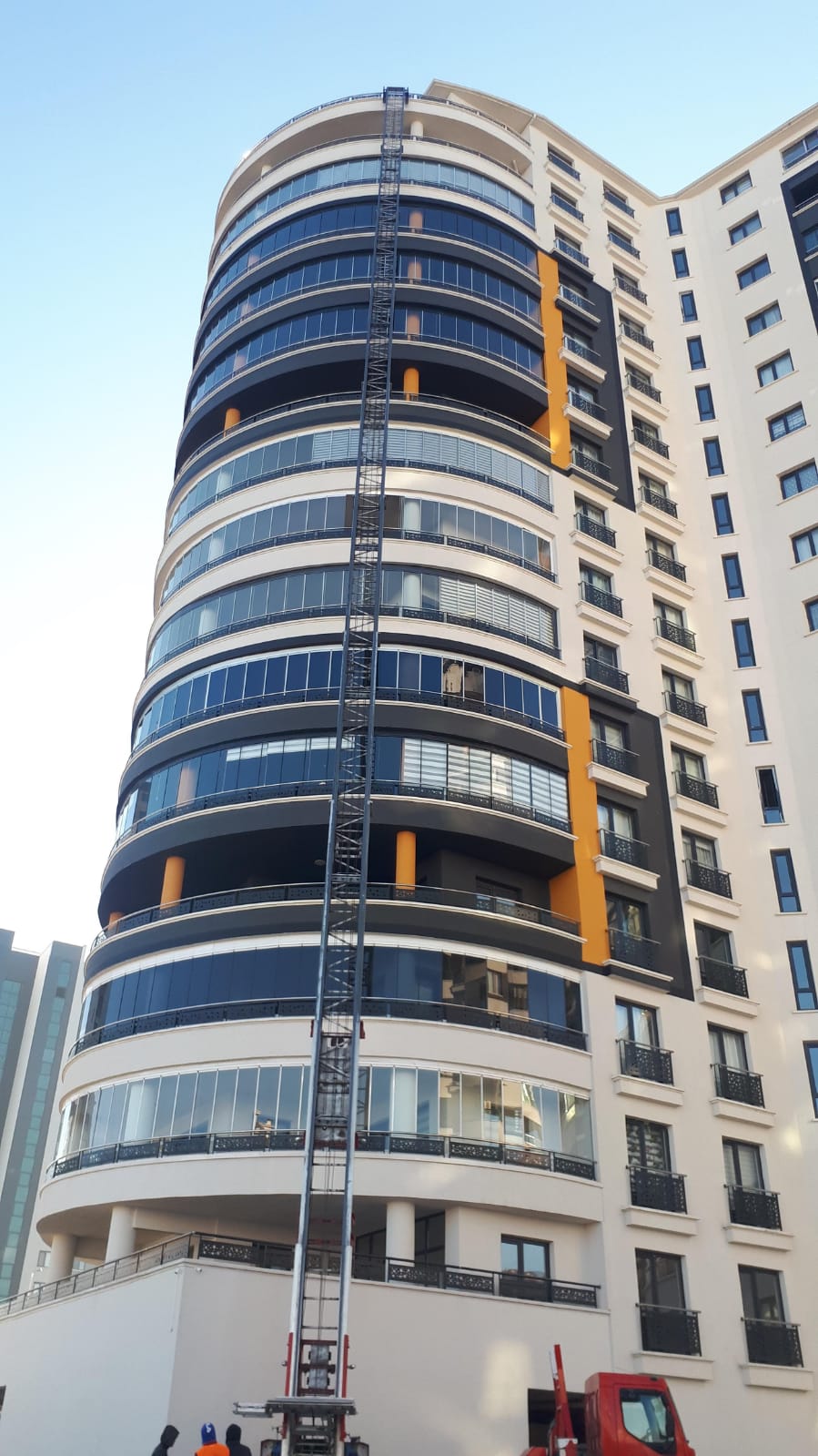 2. Asansör Kurulumu: Mobil asansör aracı, bina cephesine güvenli şekilde konumlandırılır.